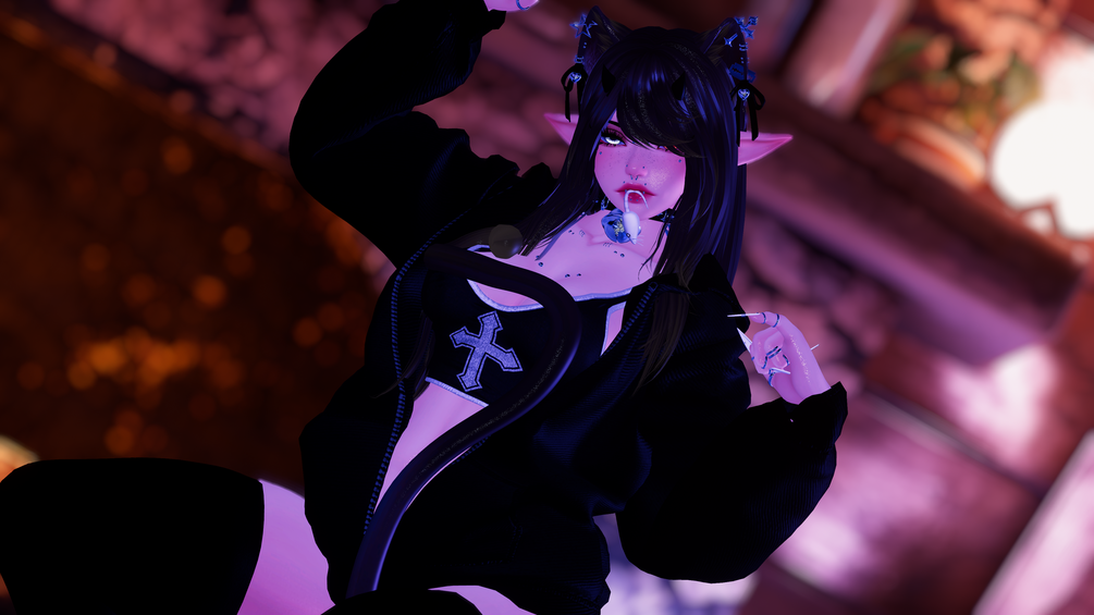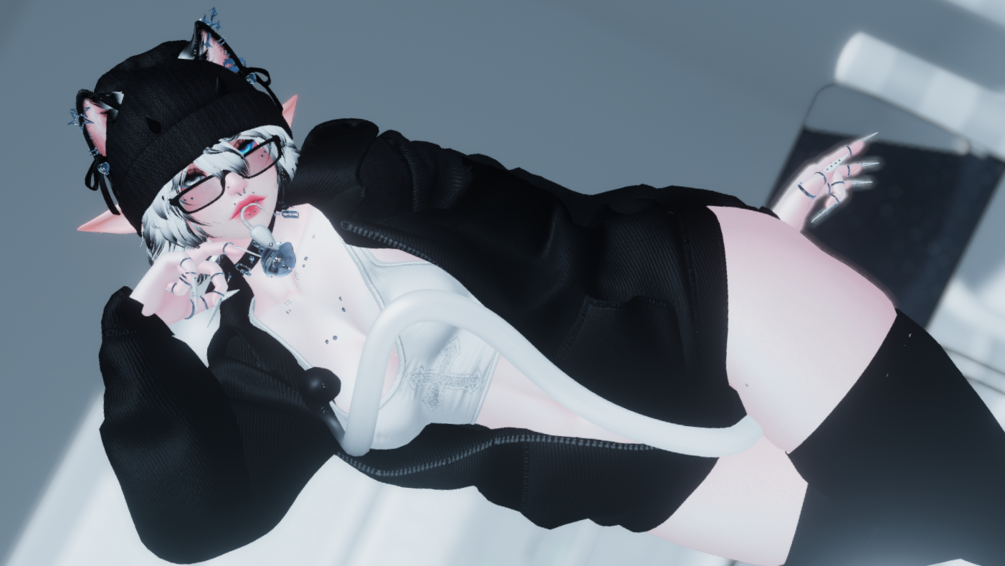 Head & Body- Sivka , ZInpia (EDITED BY ME, NO REUSE) | Beanie - Hayweee | Choker , Back Bow , Socks, Cat Ears Bottoms,- Milkymutt | Hair - Nessy & Saikura | Kitty Garter, Cat Tail , Mouth Mouse Toy - Koragira | Nails, Horns - ME | Hoodie - Saikura | Glasses - C391 | Slippers - yuriyarawr | Body Piercings, Rings - Daddyissuez | Ears - Cupkake | Eye and Hair Texture - Sivka, cicieaaavr | Vrc face tracking addon - threevee